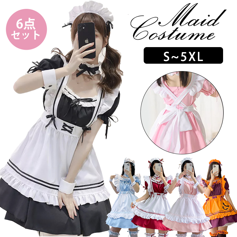 メイド服 メイド 服 6点セット コスプレ 可愛い 女の子 レディース メンズ 半袖 ロリータ ワンピース リボン 黒 ピンク ハロウィン 衣装 大きいサイズ 定番 男性ウケ かわいい 洋 S-5XL