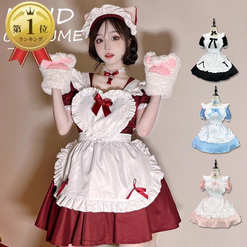 メイド服 コスプレ 猫 ネコ耳 かわいい フリル セクシー 赤 ブラック ゆめかわ 大人 レディース バレンタイン エプロン カチューシャ 半袖 スカート ワンピース 白 黒 ピンク 仮装 大 リボン