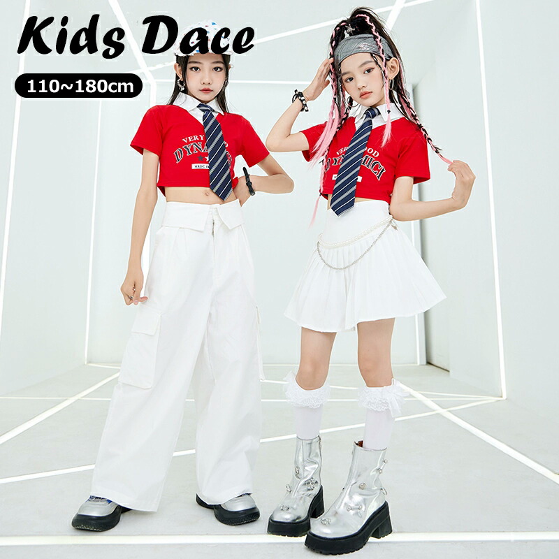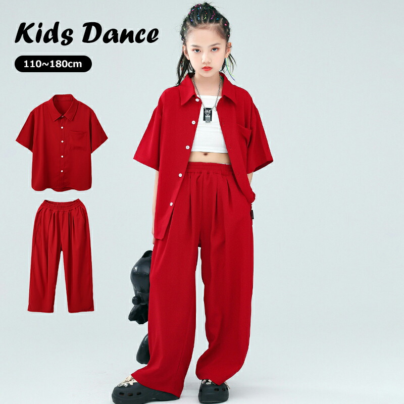 キッズ ダンス衣装 赤 レッド 半袖 チア セットアップ イベント かっこいい 女の子 男の子 韓国 ヒップホップ HIPHOP K-POP ジャズ ストリート ダンスウェア 練習着 演出服 ダンス