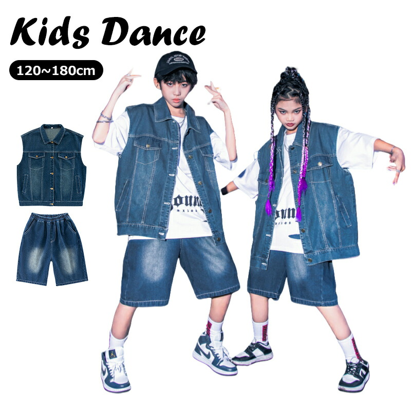 キッズ ダンス衣装 ベスト デニムパンツ セットアップ イベント かっこいい 女の子 男の子 韓国 ヒップホップ HIPHOP K-POP ジャズ ストリート ダンス 練習着 演出服 発 ダンスウェア