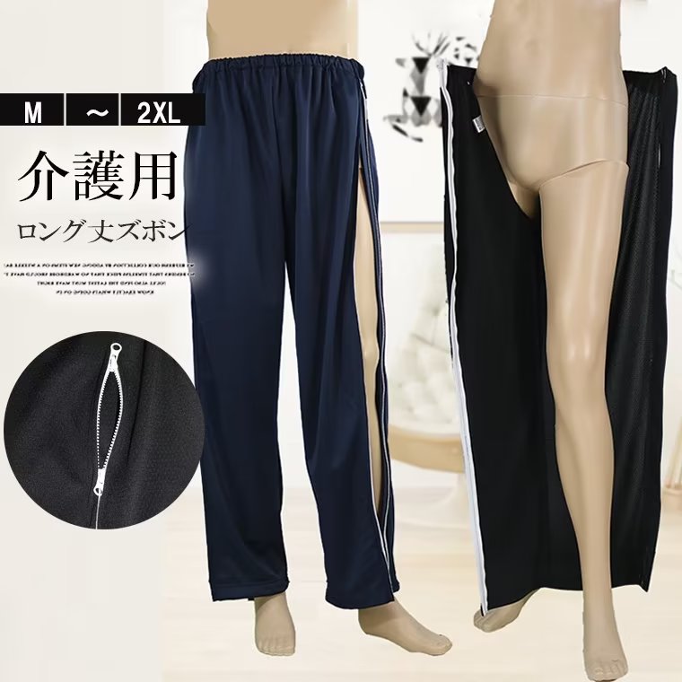 オールシーズン対応の2タイプ生地 ファスナー全開 フルオープン ロングパンツ レディース メンズ 両脇全開 介護ズボン ウエストゴム 通院 着脱簡単 部屋着 パンツの着替え