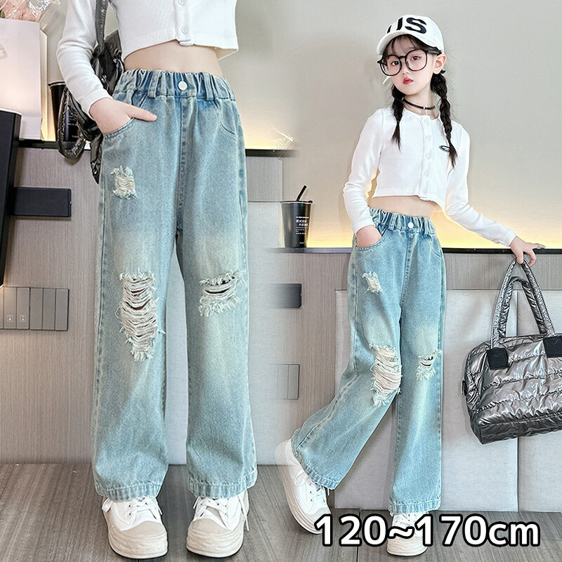 デニムパンツ キッズ ジーンズ ジーパン ボトムス ロングパンツ ワイドパンツ おしゃれ 長ズボン ダメージ加工 ダメージ ストレートパンツ 韓国 ジュニア 女の子 ゆ 子供服