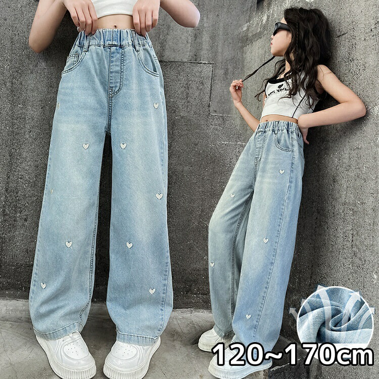 ハート刺繍 デニムパンツ キッズ ジーンズ ジーパン ハート柄 ボトムス ロングパンツ ウエストゴム 薄手 ワイドパンツ おしゃれ 長ズボン 韓国 子供服 女の子 ゆったり 通 ジュニア
