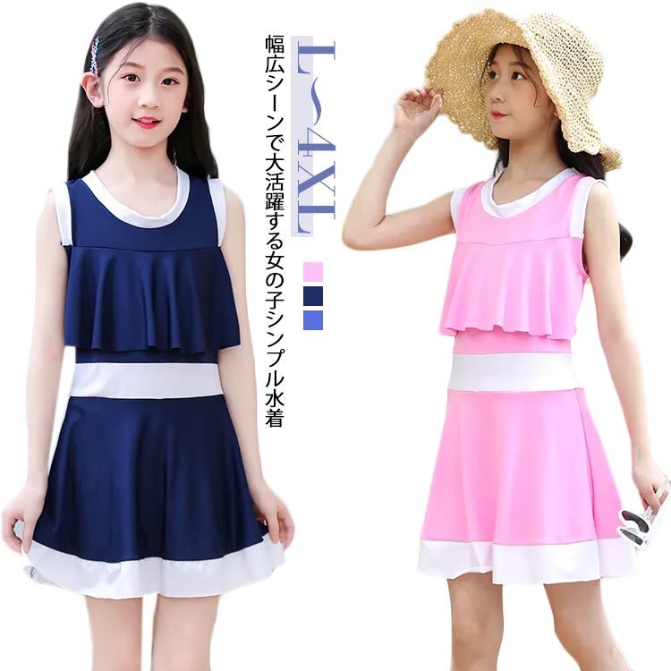 スクール水着 女の子 ワンピース ノースリーブ シンプル 小学生 体型カバー キッズ ジュニア 紺色 スイムウエア 露出控えめ 水着 スカート 女子 女児 パット付き 大きいサイズ か 子供