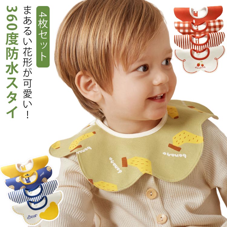 プレゼント 360 くるくるスタイ 前掛けまるいスタイ よだれカバー 綿100% ベビー ナチュラル 綿 コットン 防水 可愛い 男の子 女の子 おしゃれ スタイ 子供 キッズ 4枚セット 赤ちゃん