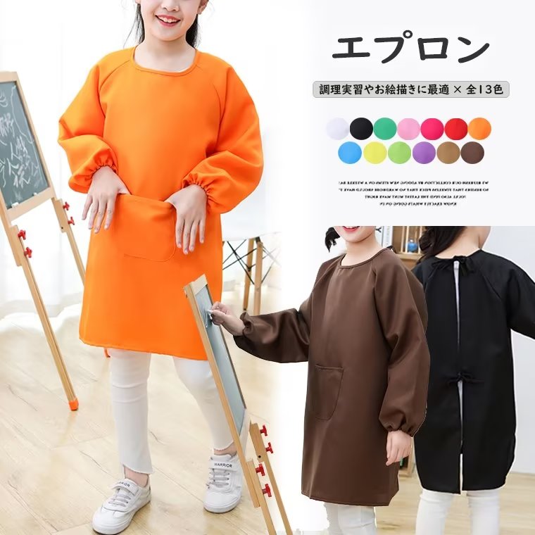 3歳から15歳まで使える キッズ 子供用 エプロン 長袖 スモック ポケット付き 絵画 工作用 粘土 女の子 男の子 無地 外遊び