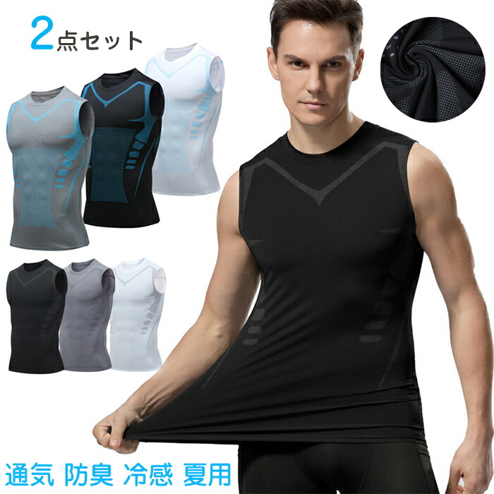 UVカット 夏用 冷感 通気防臭 シャツ スポーツ アンダー パワーストレッチ ウェア 2点セット 半袖 メンズ コンプレッション