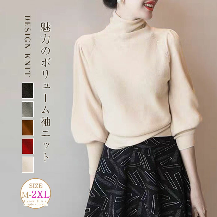 送料無料◎メール便発送 パフスリーブ ニット セーター カットソー トップス レディース 春 秋 冬 長袖 ニットセーター ハイネック プルオーバー ベーシック 大人 お洒落 無地 ゆったり