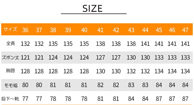 41:全長138cm 胸囲130cm モモ幅82cm 股下~靴81cm 靴サイズ25.5cm