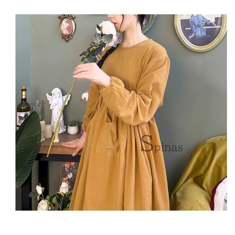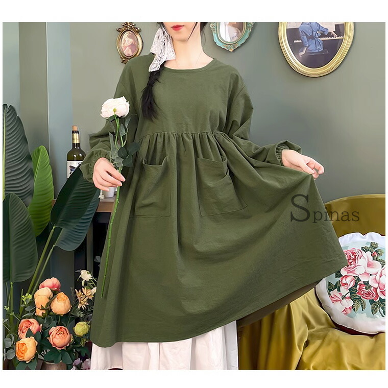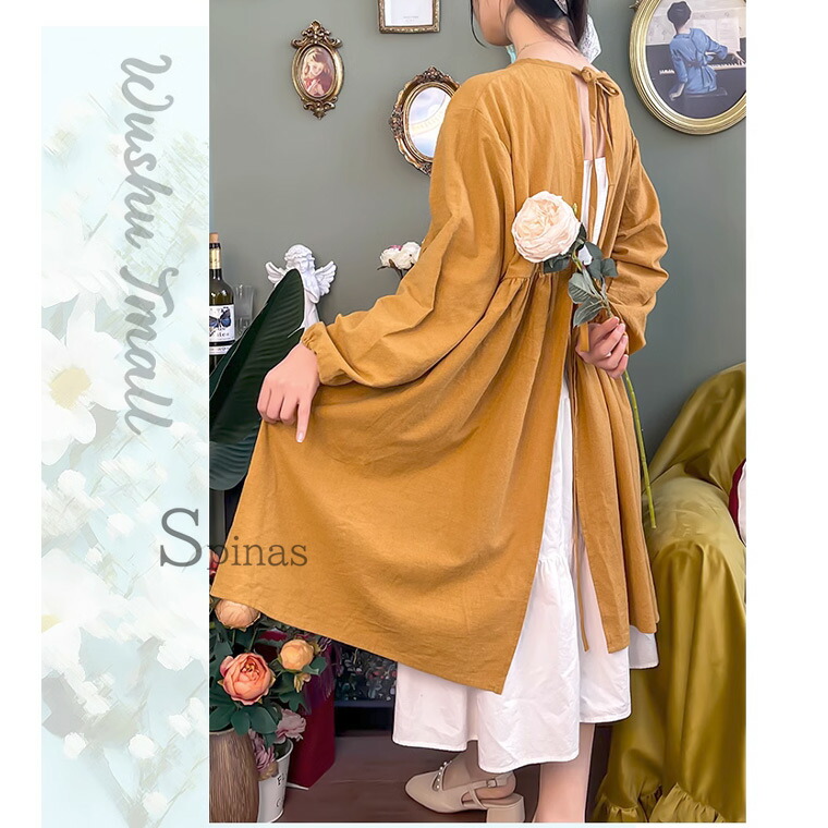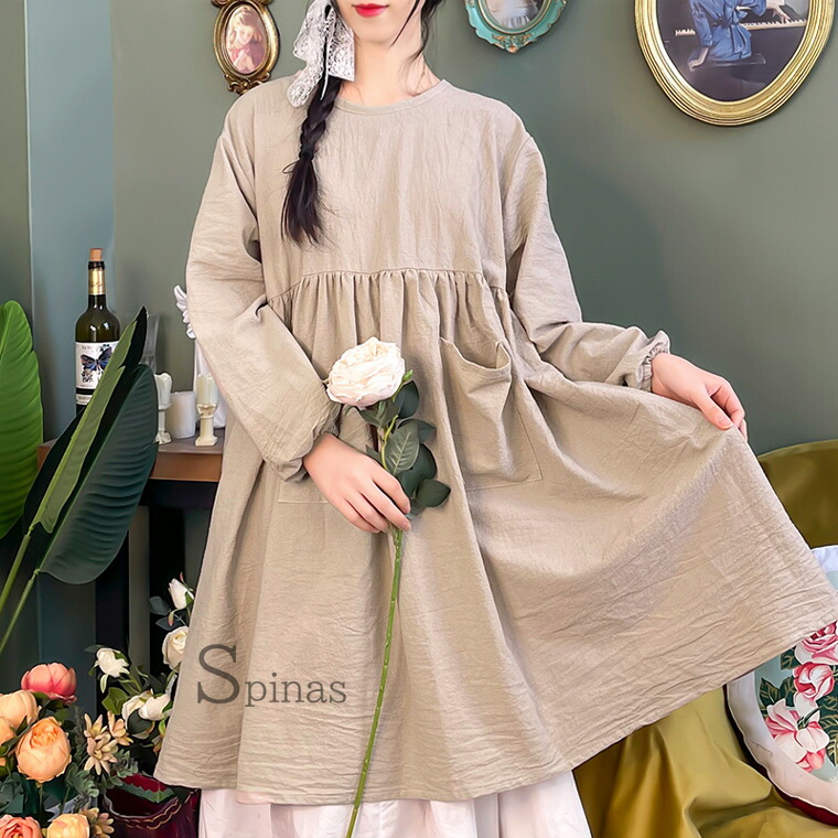 ワンピースのような長袖エプロン 割烹着 ン カフェエプロン H型 ボタン チュニックエプロン ワンピース かぶる ワークエプロン 北欧風 ミドル
