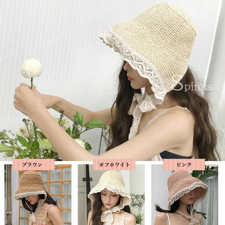 大人上品な レース付き麦わら帽子 ロリ 帽子 レディース帽子 麦わら帽子 新作 ブラウン オフホワイト ピンク