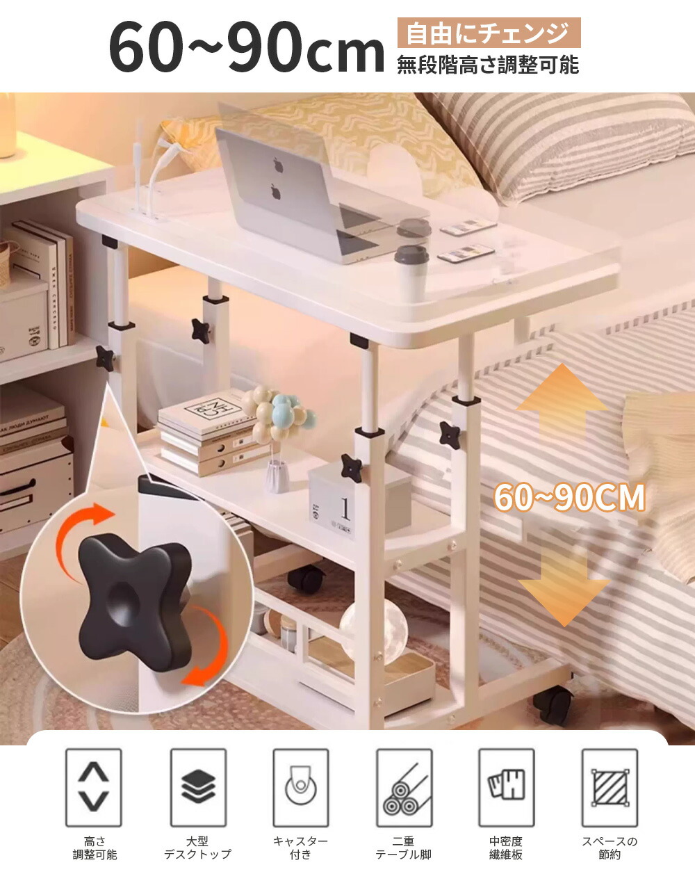 サイドテーブル キャスター付き ベッドテーブル ナイトテーブル 昇降式 テーブル 北欧 キャスター 折りたたみ 介護 高さ調節 省スペース デスク 白 カフェテーブル 四角 一人暮ら リビングテーブル