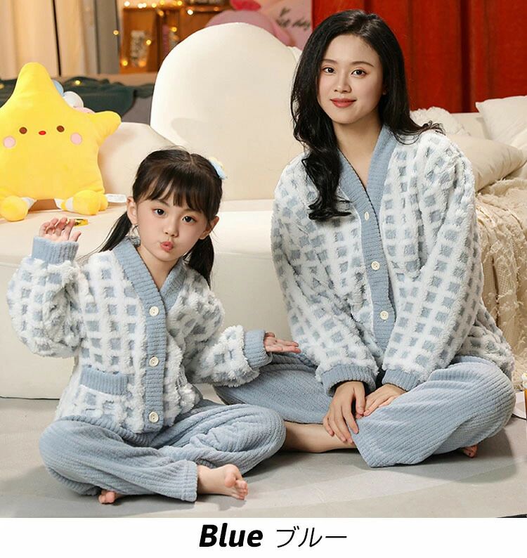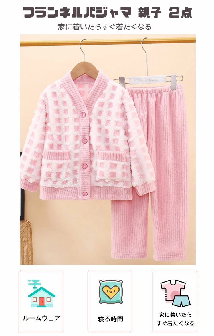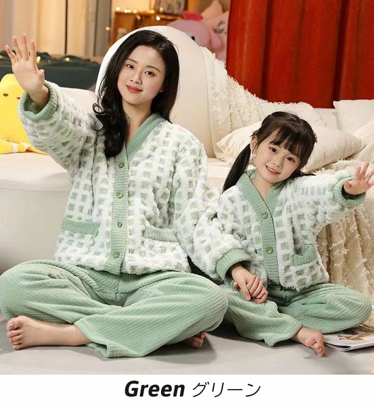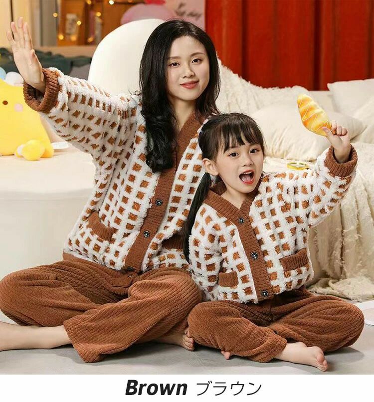 親子ペア モコモコパジャマ 裏起 フラ ピンク ブルー ブラウン グリーン 100 110 120 130 140 150 L XL 2XL