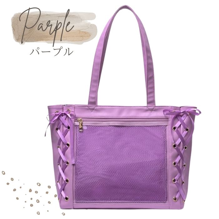 ☆ レースアップのデザインが可愛いトートタイプの痛バック です! 推し の写真、缶バッジ、ストラップ などを入れて自分の好みの痛バにアレンジしてください♪ ☆ 缶バッジ装飾用のメッシュシートも 付属します! ☆ 収納力抜群!A4のファイルも日用品もしっかり入るサイズ感がおすすめ♪ ☆ レザー調の素材を使っており、可愛さに上品さをプラス◎ 6色展開ですのでお好きなカラーをお選びください!