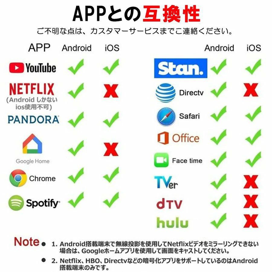 適用機種 :Miracast/Airplay/DLNA をサポートします。Android 4.4 および iOS 9.0、MacOS 10、Windows 8.1 と互換性があります (Miracast が有効になっている必要があります。最初に確認してください)。ほとんどのビデオ Web サイト (アプリまたはオンライン) をサポート - YouTube、Facebook、Twitter。Netflix/ iTunes/ Amazon Video/ HBO go/ Hulu Plus/ Honda Motor/ ESPN/Google Pixel などの著作権が必要なアプリには対応していません。友人の集まりや家族の再会の間、会議、自宅、教室の大画面でプレゼンテーションやファイルを共有できます。