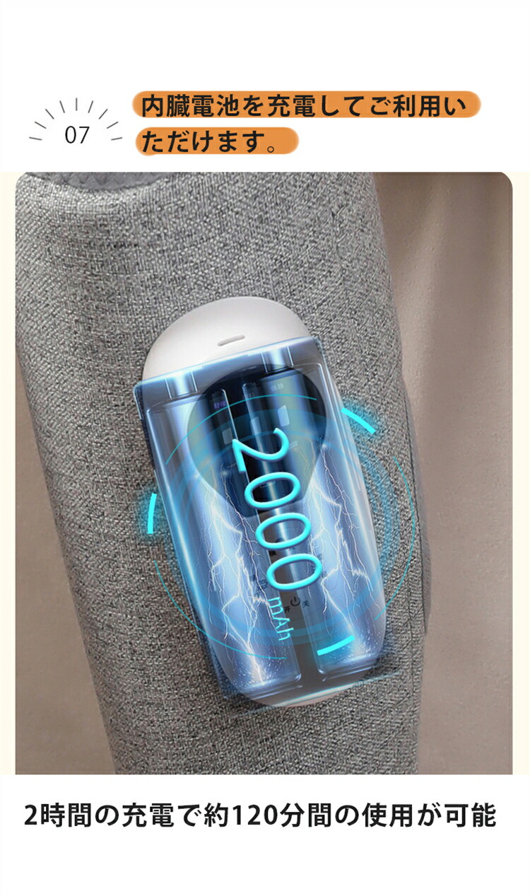 2,000mAhリチウムイオンバッテリーを採用しており、1.6~2時間の充電で120分間ご使用いただくことができます。出張や旅行にも持ち運んでどこでも簡単にご使用いただけます。