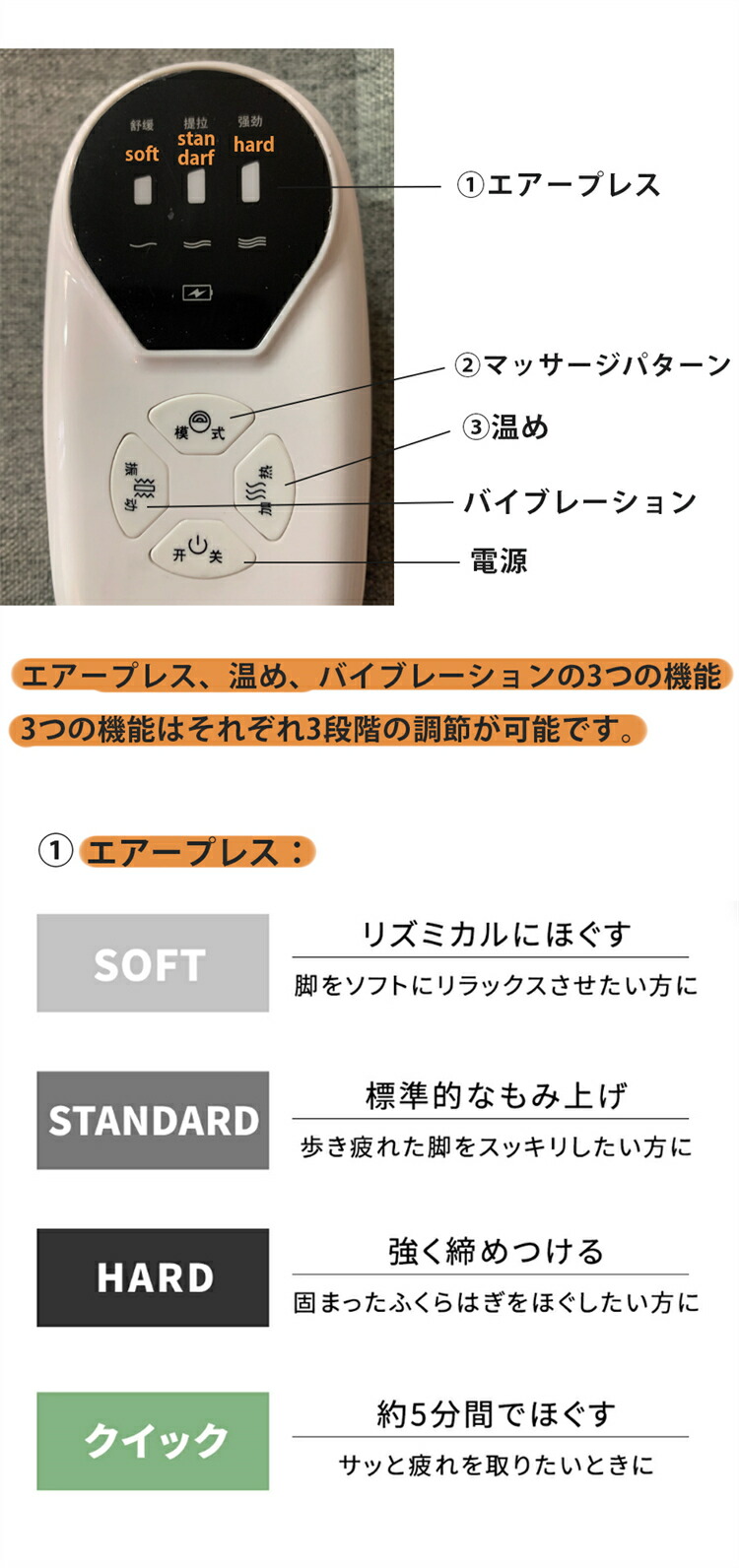 3つの機能はそれぞれ3段階の調節が可能です。人の手のような感覚を体感できるエアープレス機能、じんわりと深部まで温める温め機能、着用部を程よく刺激するバイブレーション機能、それぞれを使い分けて日々頑張る足をリフレッシュさせましょう。