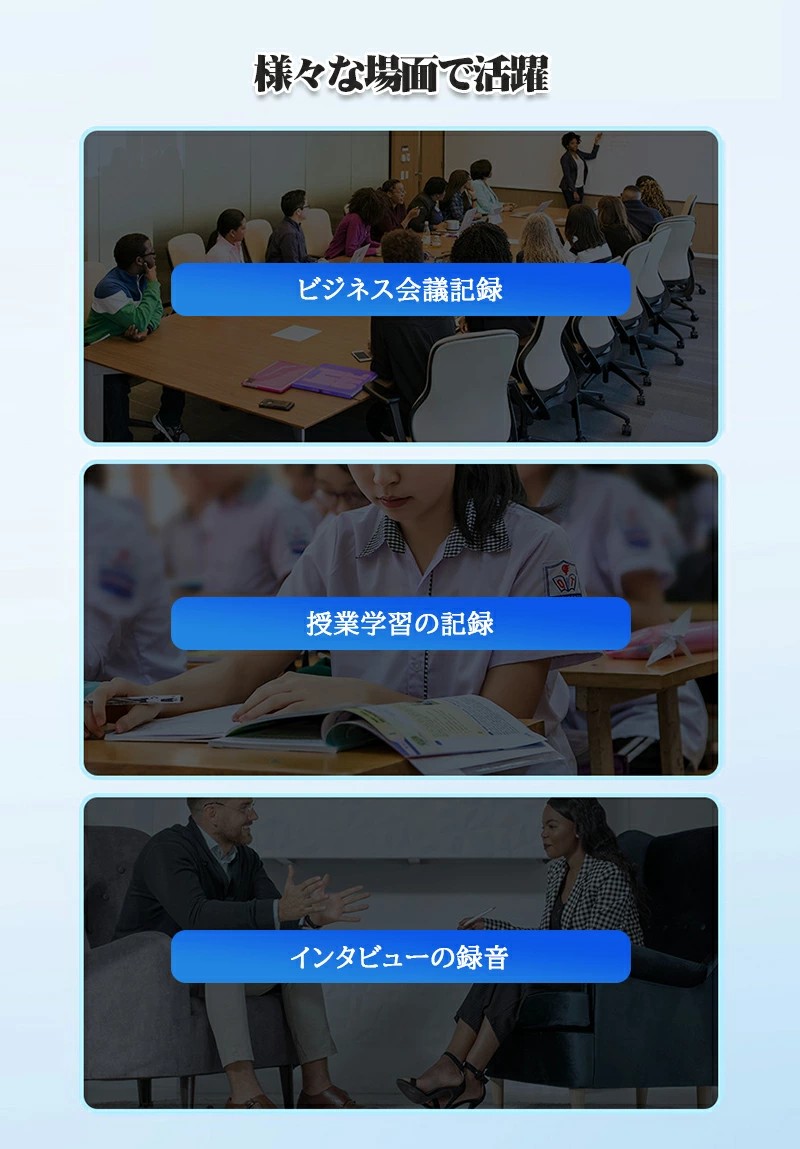 本体にワンボタンで録音を開始する便利な機能を備えて、直感的な操作で、重要な瞬間を逃すことなく迅速に録音を始めることが可能です。会議やインタビュー、学習シーンでの活用に!