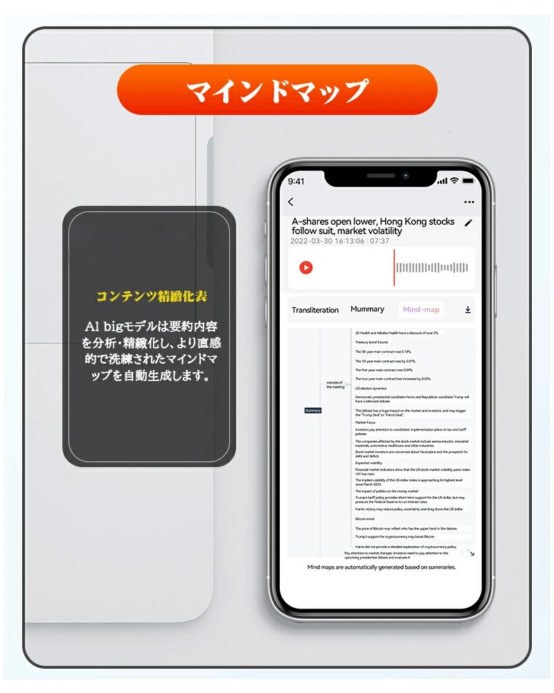 音声の録音からテキスト化、その後の整理まで、すべてこの一台で完結できます。音訳や概要の生成、さらにマインドマッピング機能も備わっており、毎日400分まで無料でご利用いただけます。足りない時にも120分/600分/3000分/6000分の時間パックをご購入いただけます。会議の内容を視覚的に整理し、次回への準備に生かすことが可能です。