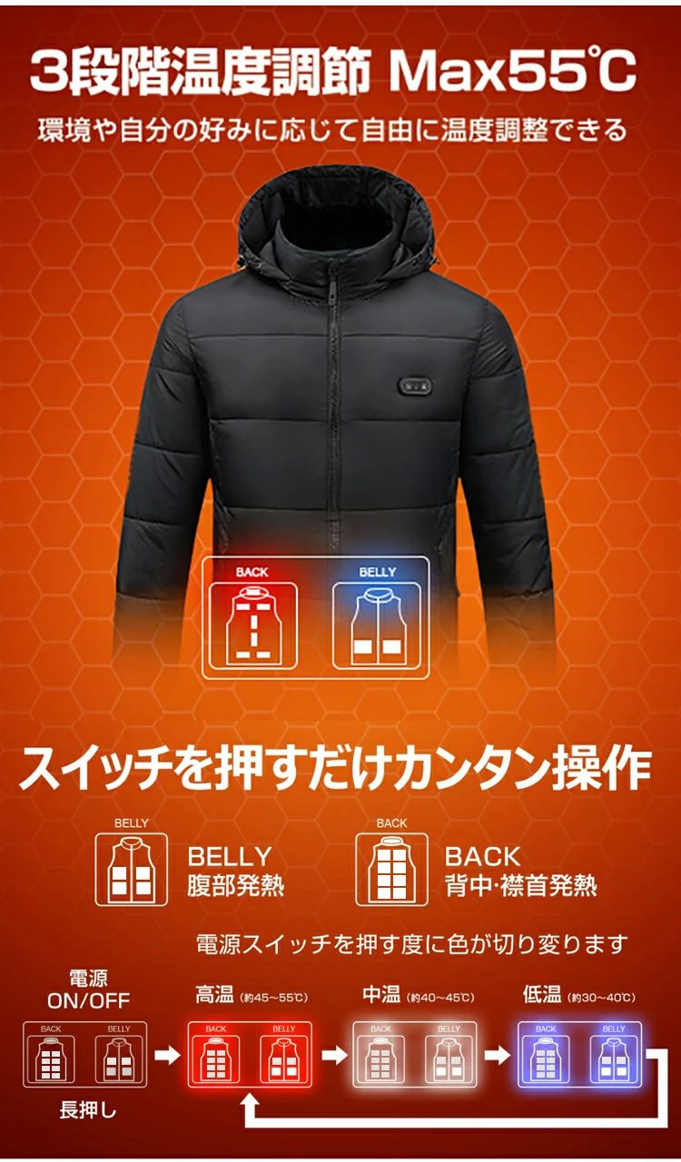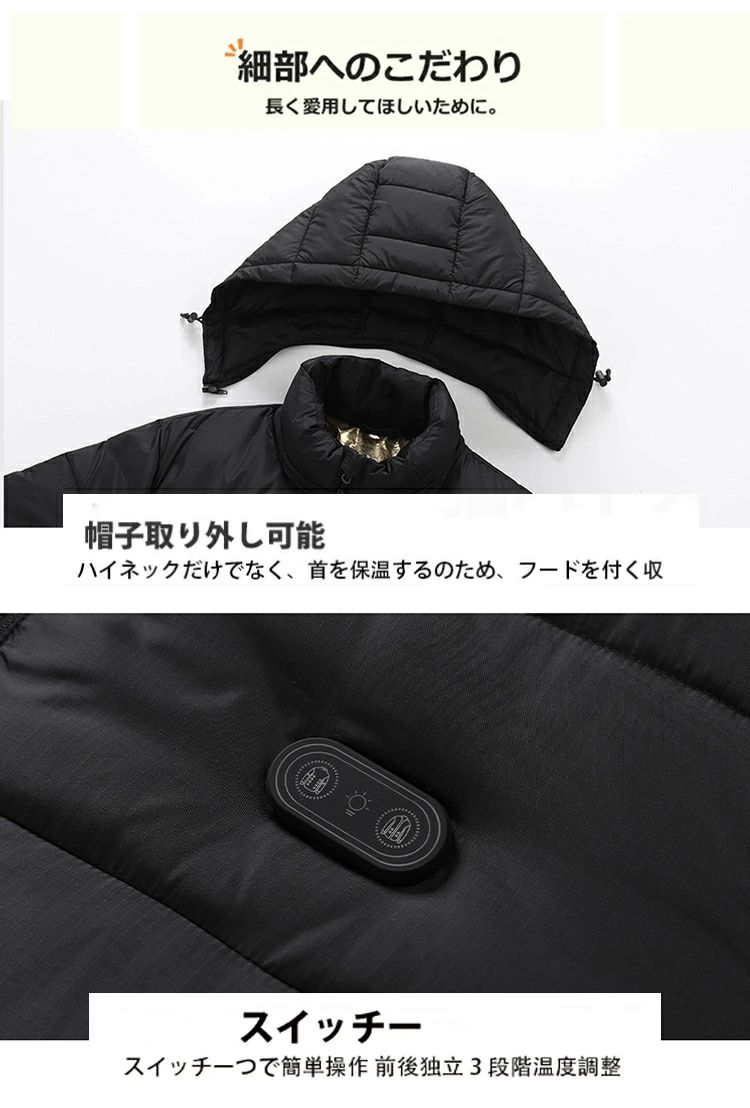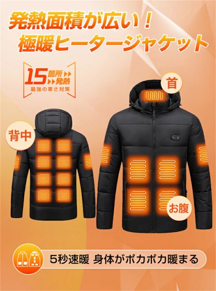 防寒 ブルゾン 電熱ウェア レディース メンズ usb ベスト 電熱 上着 アウター 15エリア発熱 長袖 フード付き インナーパーカー
