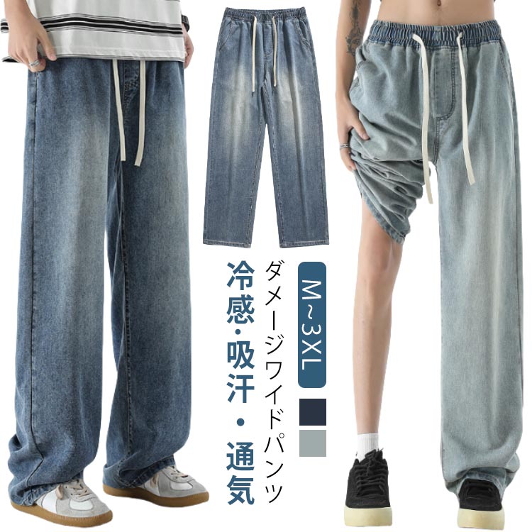 デニムワイドパンツ ストレート ダメージ ワイド デニム ジーパン ジーンズ デニムパンツ ロングパンツ 涼しい ワイドストレートパンツ 無地 ゆったり 薄手 ワイドパンツ メンズ夏 ウエ カジュアル
