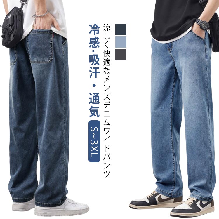ジーンズ デニムワイドパンツ メンズジーパン デニムパンツ 薄手 通気性 ワイドパンツ ワイド 涼しい 冷感 ジーパン ゆったり ストレート カジュアル ワイドストレートパンツ ウエストゴム 調 無地