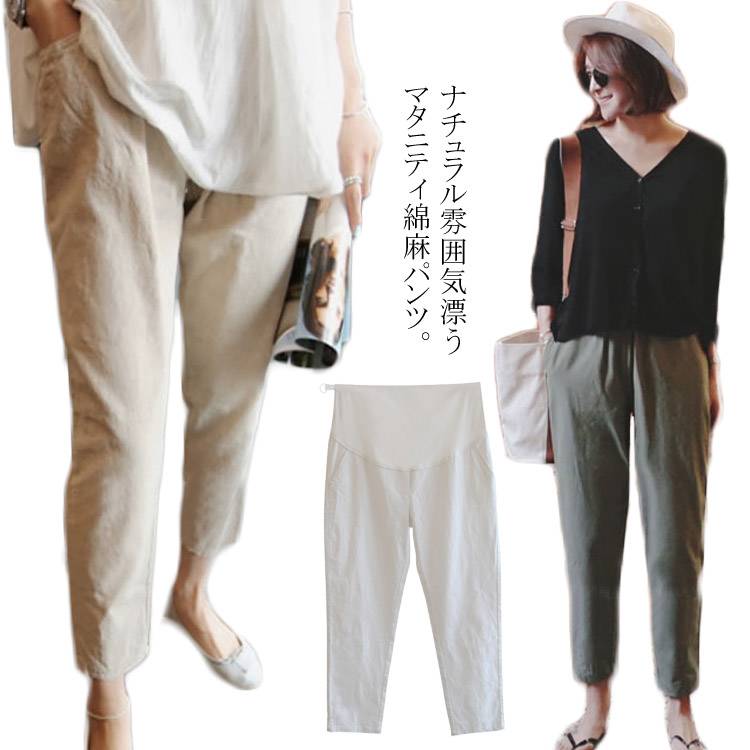 マタニティ 綿麻パンツ リネンパンツ マタニティ ママ マタニティウエア 授乳服 ボトムス パンツ 早い者勝ち カーキ ホワイト ベージュ M L XL