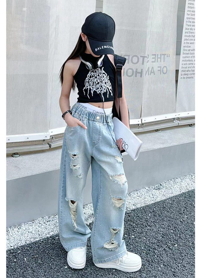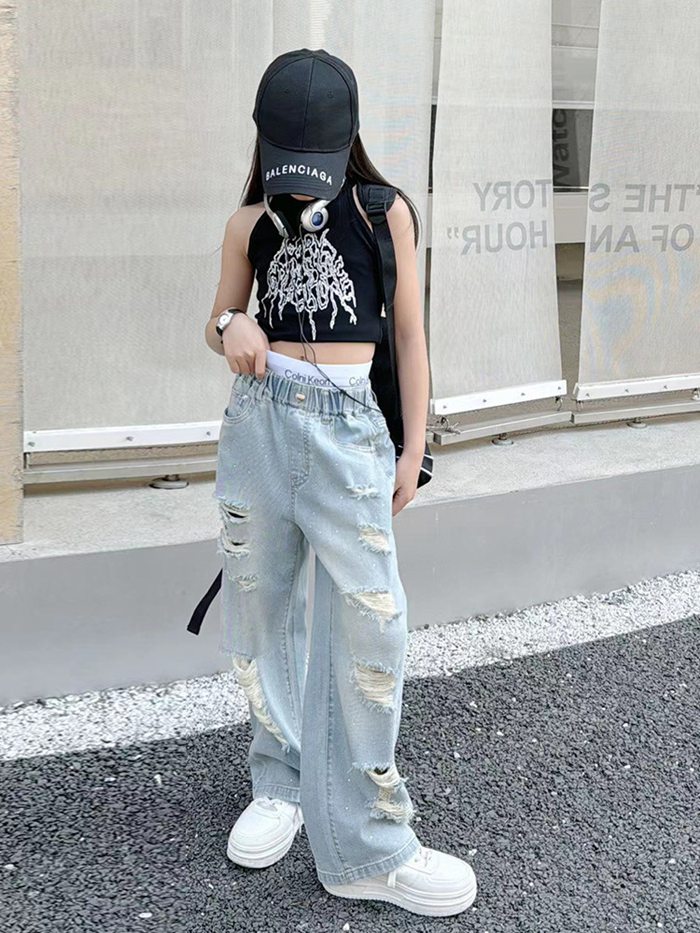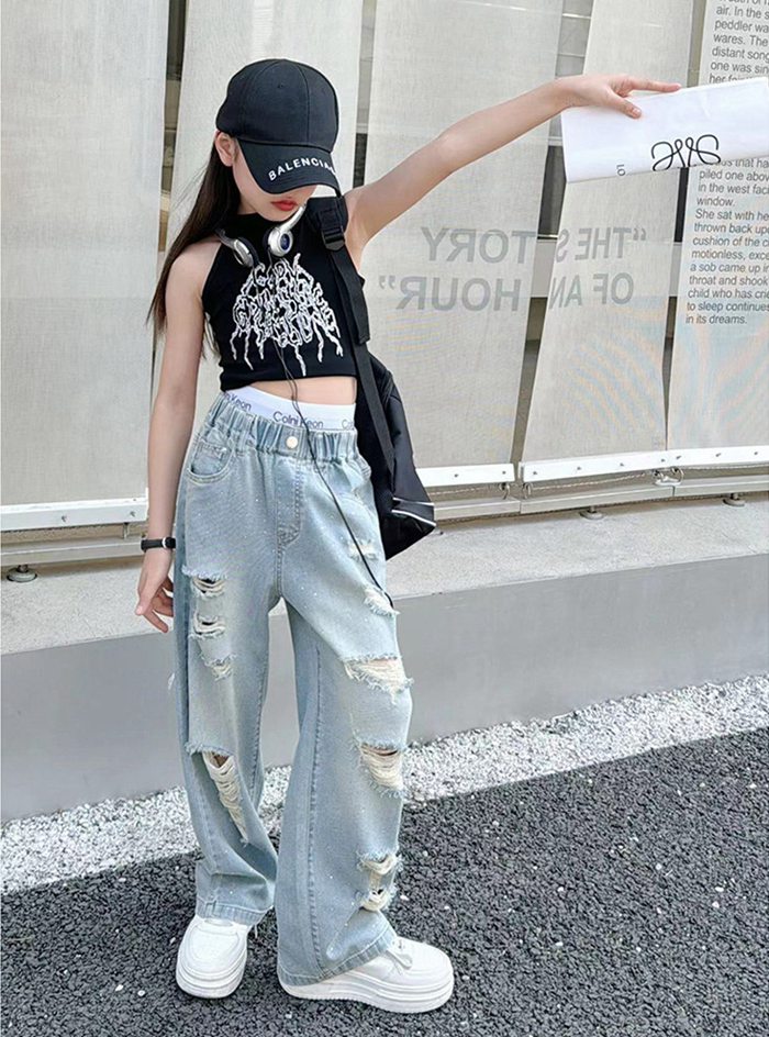 子供服 デニムパンツ ダメージ加工 ロングパンツ キッズ服 子供服女の子 キッズ 子供 こども ズボン パンツヒップホップジュニアダメージデニムパンツ ワイドパンツ ダンス ジーンズ 幼稚園 お 衣装