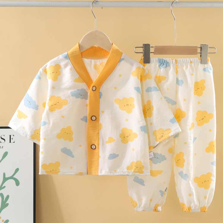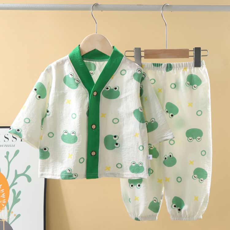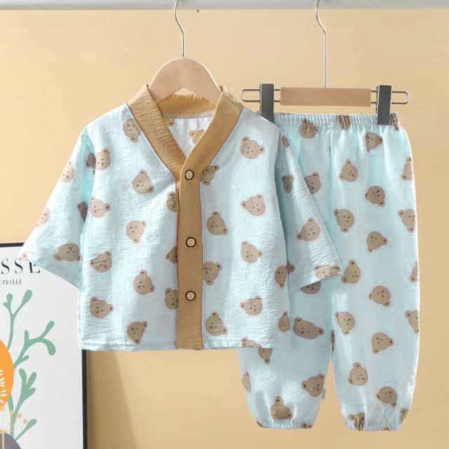 パジャマ キッズ 女の子 男の子 七分袖 前開き コットン素材 カエル くま いぬ ハート柄 曇柄 総柄 ガーゼパジャマ ルームウェア 薄手 薄地 かぶり ボタン 春 秋 子供 入園 入学 夏