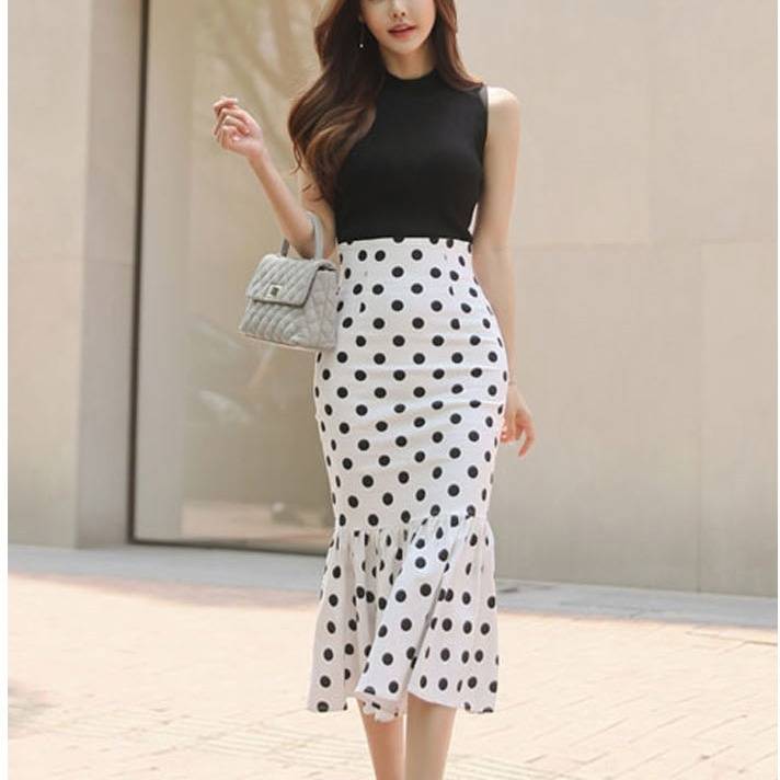 スカート レディース マーメイド ミモレ丈 春 夏 ドット柄 水玉 ブラック ホワイト 2色展開 フレア タイト ハイウエスト 休日 お出かけ デート コーデ 女子会 通勤 エレガント おし 普段使い