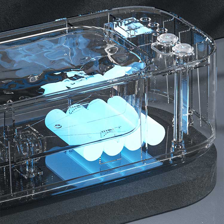 超音波の振動で目に見えない気泡(キャビテーション)を発生させ、気泡がはじける瞬間の衝撃波が手の届かない微細なすき間の汚れを取り除きます。