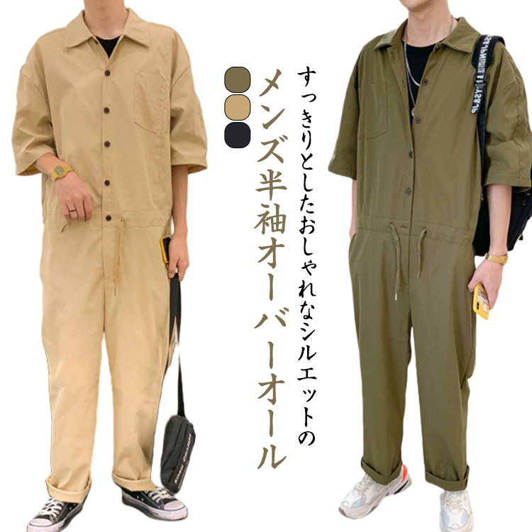 つなぎ オーバーオール メンズ 5分袖 オーバーオール 続々登場 ブラック アーミーグリーン ベージュ M L XL 2XL