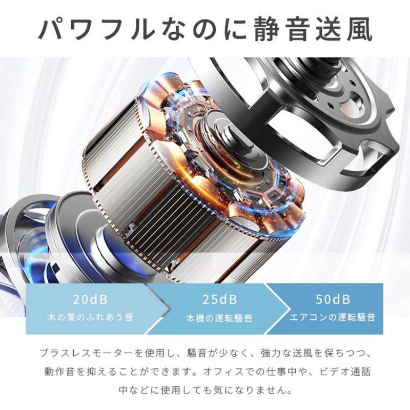 市販品の手持ち扇風機などよりもファンの音が気になってしまいがちですが、高性能モーターを採用しており、強力な風量を確保しながらも回転音が気にならないミュート設計です。 会議や病院などの音が気になる場所でも気をつかわず使用することができます。