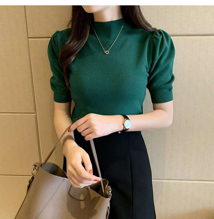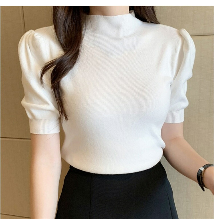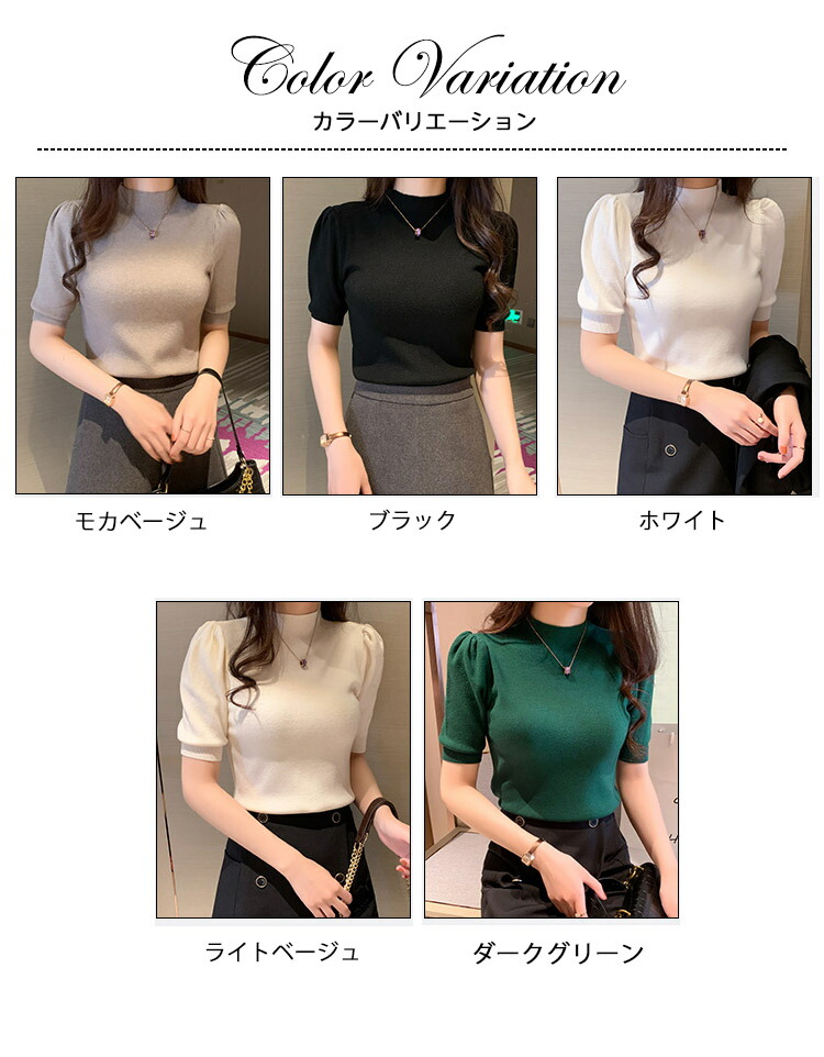 リブニット パワーショルダー5分袖 秋 さらっとした肌ざわり サマーニット ハーフタートルネック 半袖リブニット トップス オフィスカジュアル スタンドネック ニット カットソー 無地 大人 Tシャツ