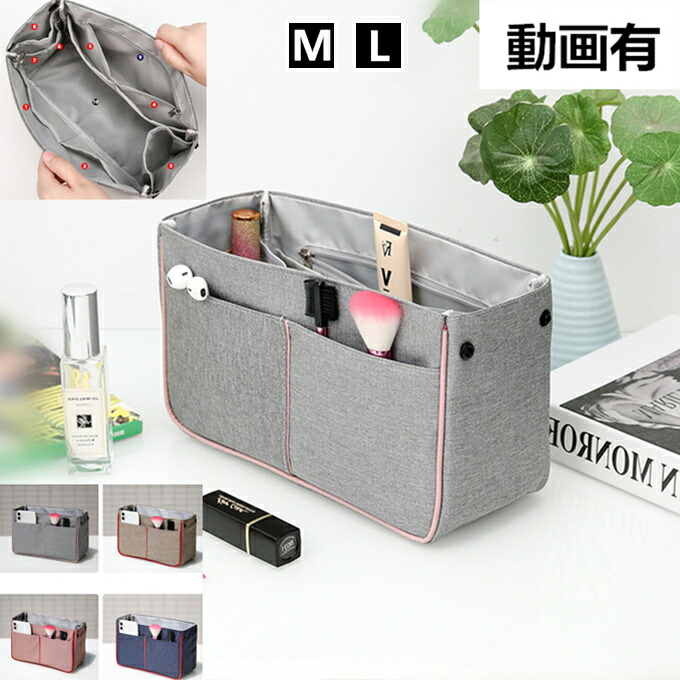 バッグインバッグ ポケット多い 12ポケット ポーチ 軽量 軽い 広い底 自立 マチ広め スナップ釦 男女兼用 コスメバッグ 軽量バック パイピング 配色 ツートーン 小物 旅行 M L グレー 出張