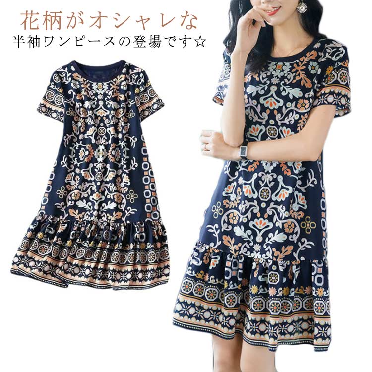 ワンピース レディース 半袖ワンピース 夏 ゆったり 花柄 クルーネック ひざ上