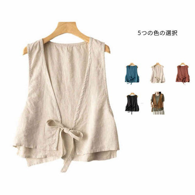 重ね着 サマーベスト 春夏 レディース カジュアルベスト 綿麻 カジュアルジレ リボンベスト ジレ 前開ベスト ゆったり ベスト おしゃれ 夏ベスト 薄手 前開き トップス 夏