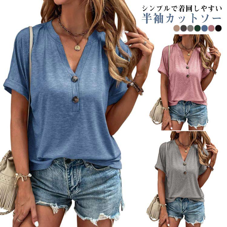 tシャツ レディース 半袖 カットソー 春夏 綿 Vネック トップス 半袖tシャツ ボタン付き 無地 肌触りの良い素材 カジュアル ゆったり おしゃれ 透けにくい シンプル 着痩せ 50 大きいサイズ