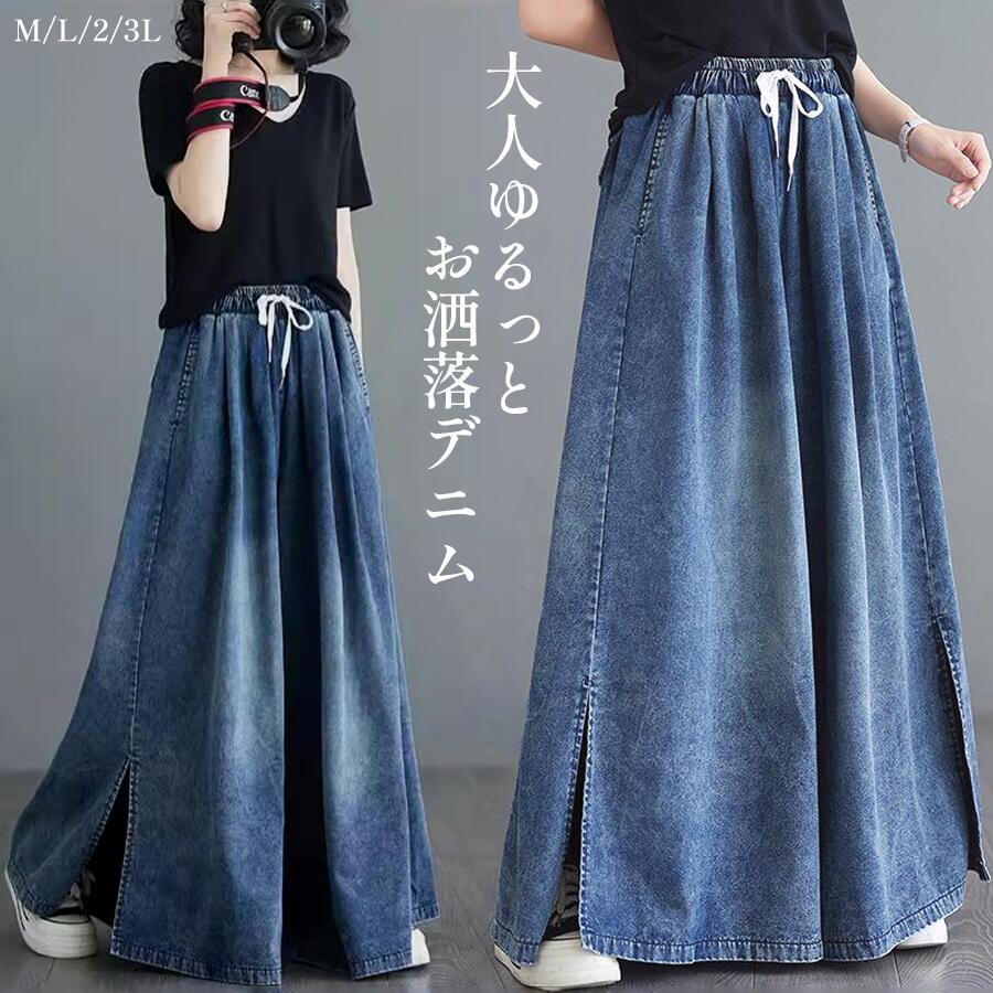 デニム ジーンズ パンツ ゆったり レディース ボトムス ウエストゴム 体型カバー きれいめ 長ズボン タック ワイドパンツ 美シルエット ゆるめ ルーズ ゆる感 ロングデニム ワイ シンプル