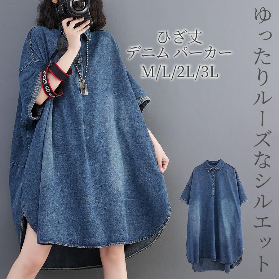 膝丈 デニム シャツワンピース デニムワンピース ロングワンピース レディース シャツカラー 半袖 Aライン ミモレ丈 折り襟 ゆるシルエット ゆったり 体型カバー 着痩せ レトロ