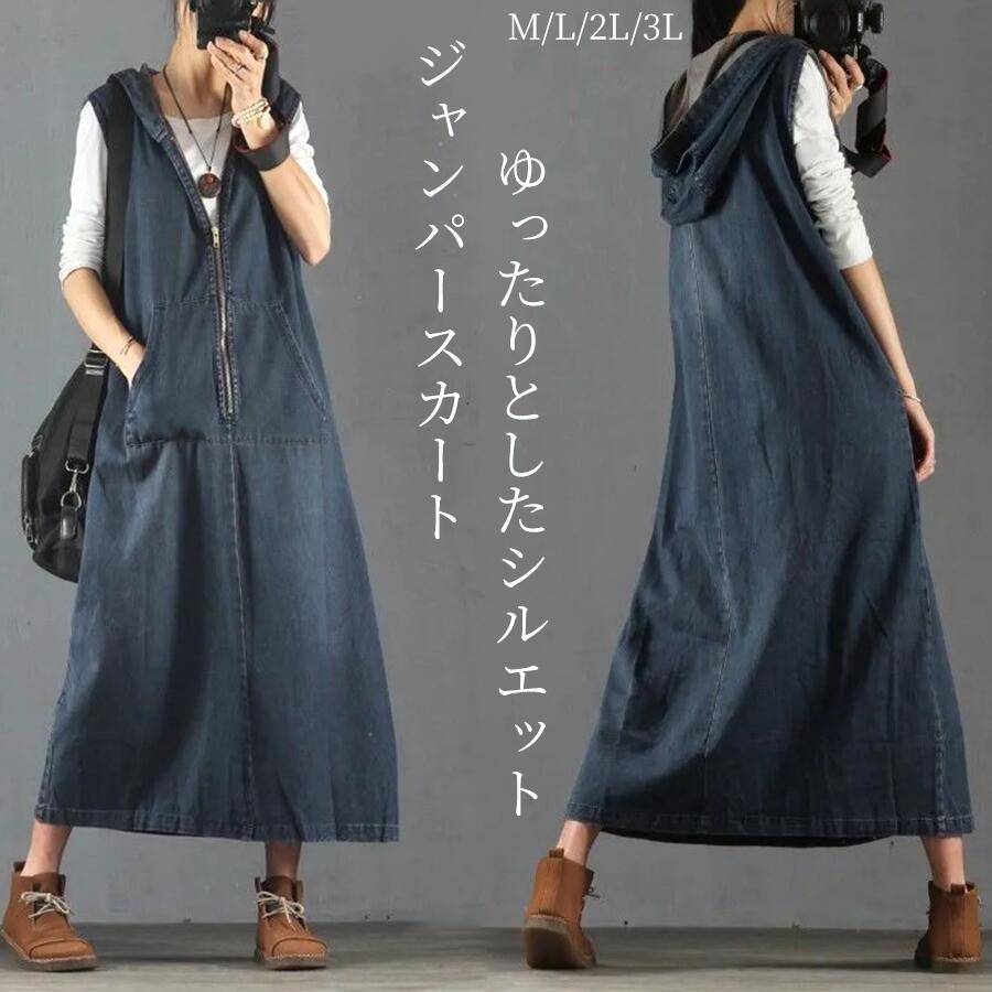 ワンピース デニム ジャンパースカート Aライン ジャンスカ カジュアル キャミワンピ 体型カバー ポケット スリット ロングスカート マタニティ 細見 フロントジップ
