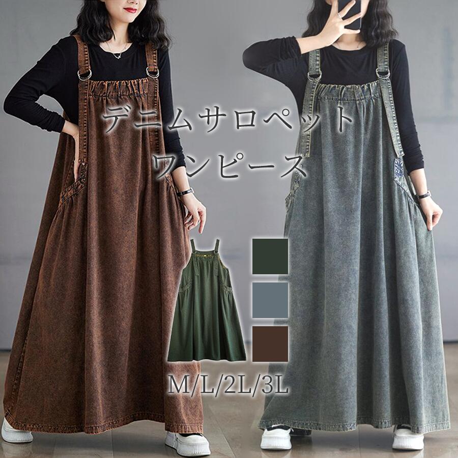 ジャンパースカート サロペットスカート オーバーオール オールインワン デニムワンピース ロング丈 デニムノースリーブ 体型カバー マキシ丈 レディースワンピース ワンピース お出かけ エプロ 大きめ