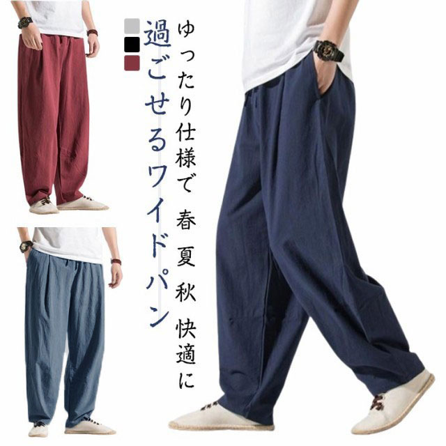 ワイドパンツ メンズ 秋 薄手 無地 ロングパンツ カジュアルパンツ 太め ボトムス イージーパンツ サルエル リラックス ウェストゴム コットン オールシーズン 長ズボン 春 夏 バギーパン 父の日