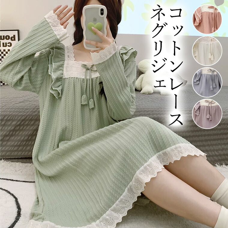 5サイズまで コットンレースが清楚なお嬢様風 妖精みたい 長袖 大人可愛い 白レース フリル 制服風 アイドル ネグリジェ レディース パジャマ ワンピース 可愛い 柔らか ロング丈 ルームウェア
