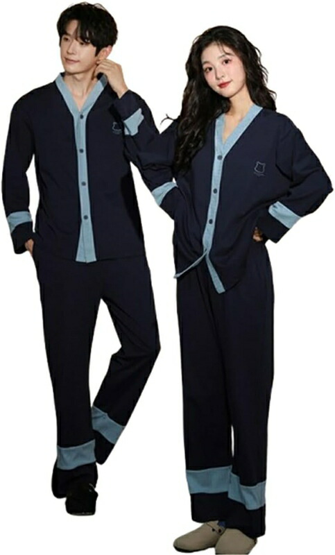 ペアパジャマ 長袖 長ズボン 綿 肌に優しい パジャマ ペア 柔らかい 快適 上下セット ペアルック 春 夏 秋 ルームウェア 前開き Vネック カジュアル 部屋着