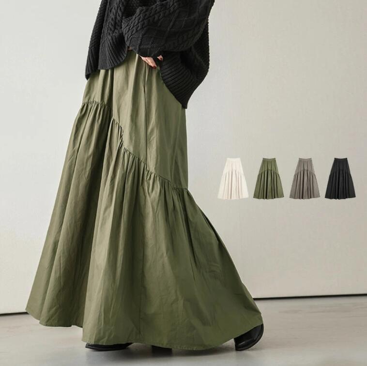 スカート マキシ丈 ロングスカート 大人カジュアル ギャザー レディース ボリューム裾 2025春夏 体型カバー フレアスカート ボトムス フレア ロング