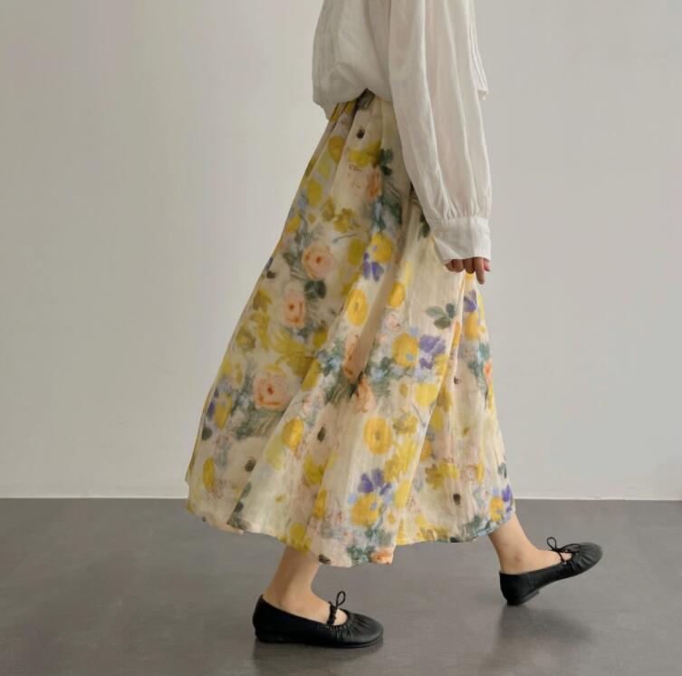 花柄スカート フラワースカート 膝丈スカート リネン風スカート ミモレ丈スカート かわいいひざ丈 膝丈 レディースフレアスカート春夏