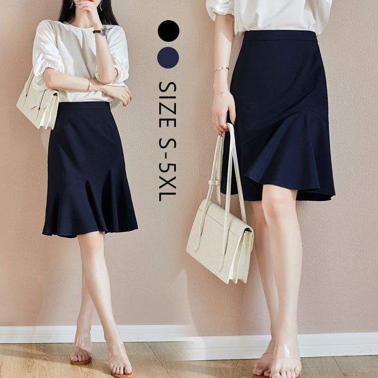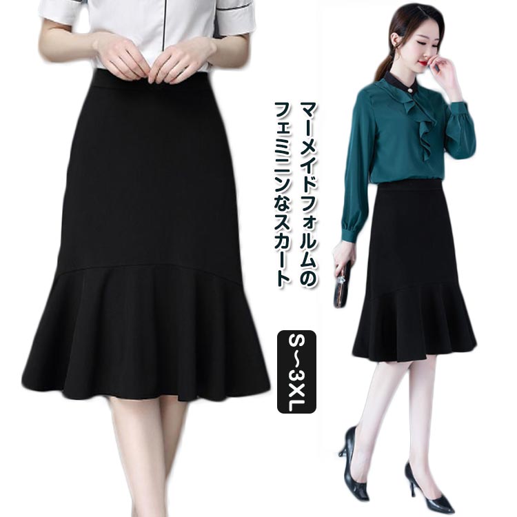 膝丈 キレイめ 通勤 スカート 無地 大人女性 マーメイド 可愛い マーメイドスカート ハイウエスト ブラック ウエストゴム