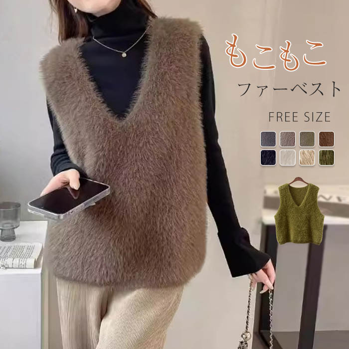 ファーベスト レディース vネックベスト 秋 冬 ベスト トップス ふわふわ ショート丈 ノースリーブ 無地 シンプル レイヤード 重ね着 もこもこ カジュアル 大人可愛い ゆったり 大きいサイズ