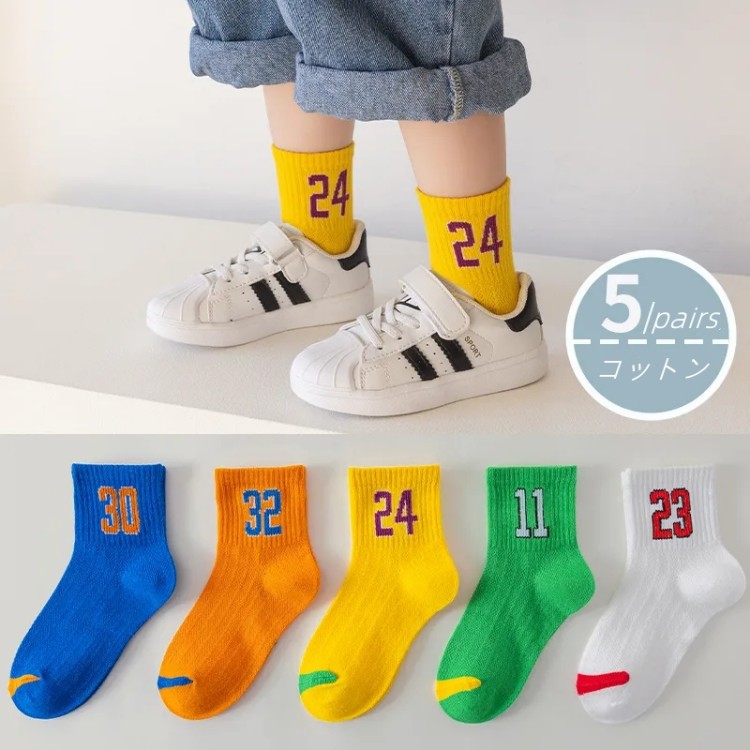 靴下 キッズ 子ども 男の子 クルーソックス スポーツ 子供 ジュニア綿 コットン くつした 通気性 ショートソックスボーイズ ナンバー 背番号 数字 クルー おしゃれソックス 5足 カラフル